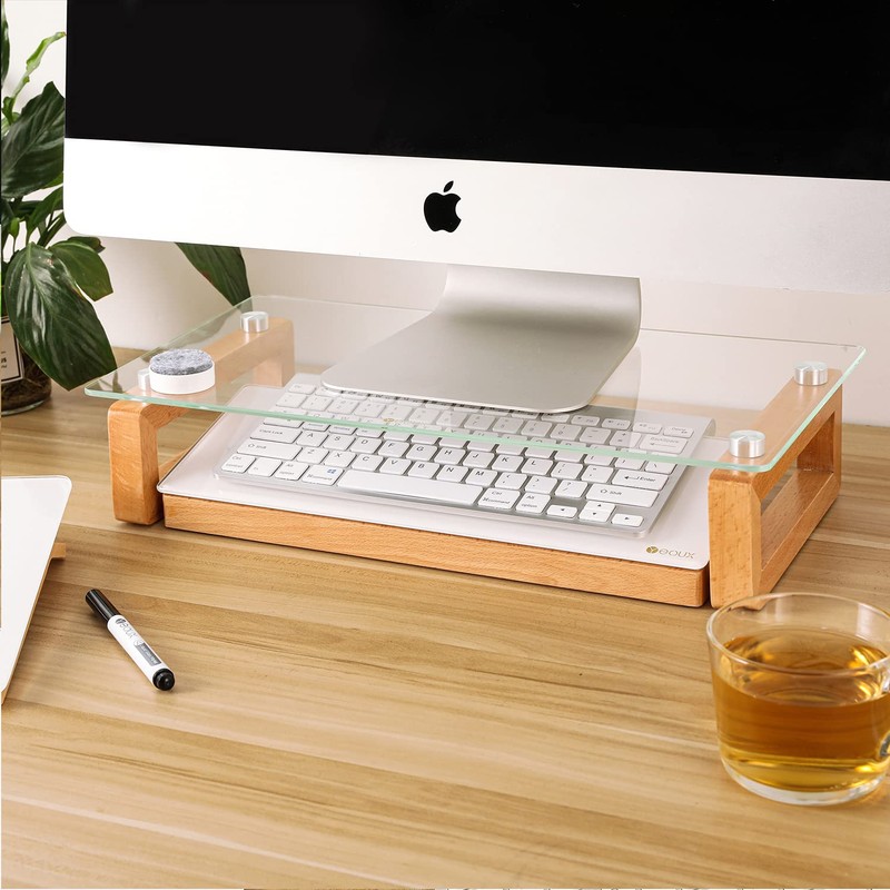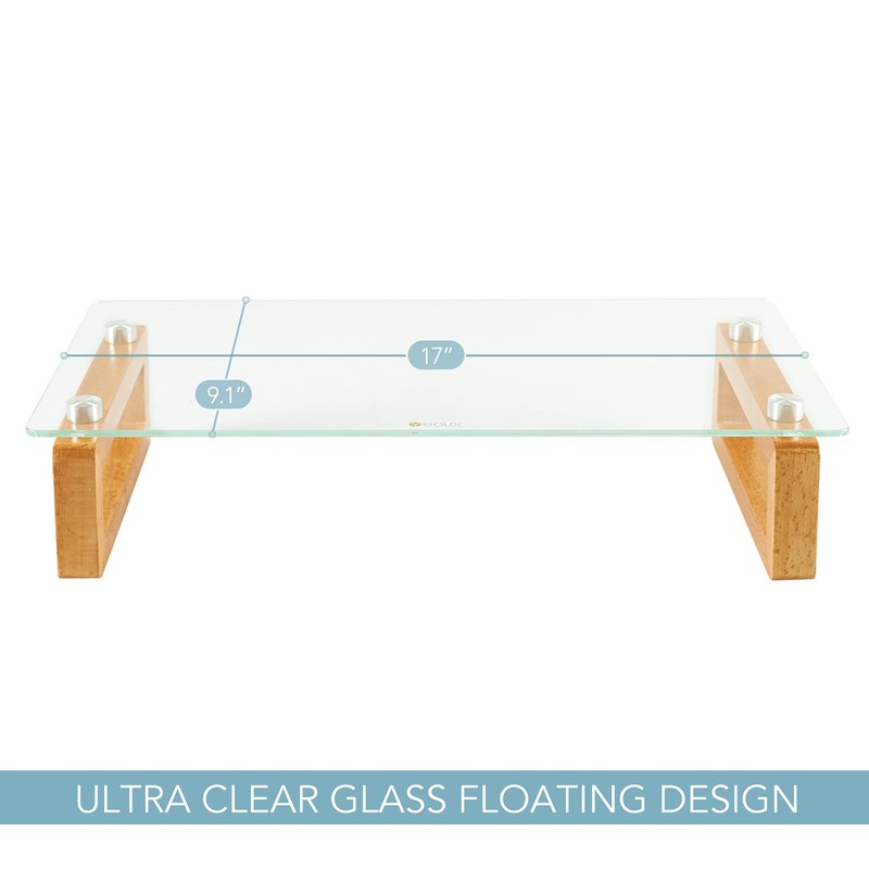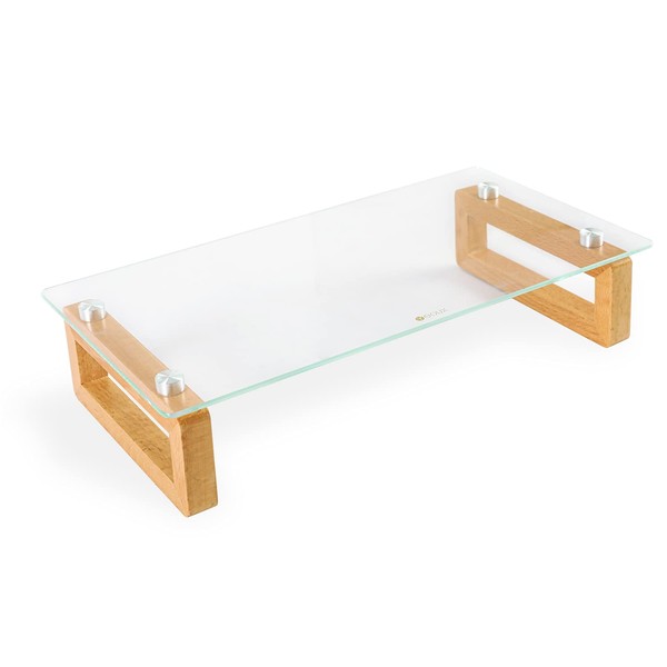 - PREMIUM MATERIAL | This clear monitor stand made of natural solid hardwood and ultra clear tempered glass with round polished edges. The anti-slip rubber pads prevent slipping or damage to your work surface. Durable, steady, no wobby, design for long term use.