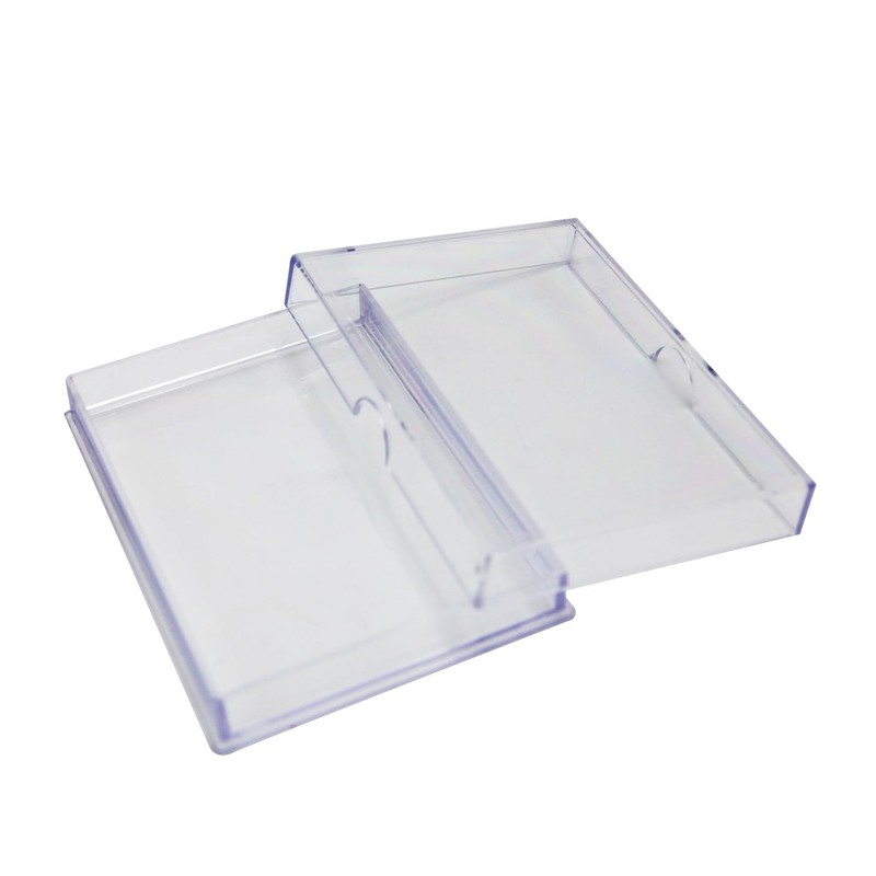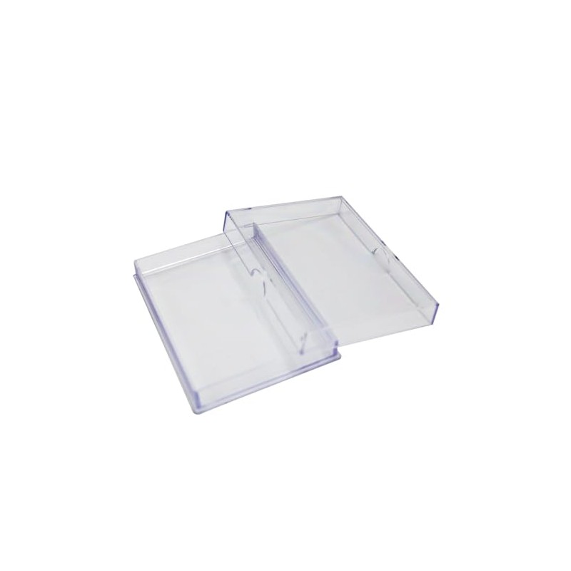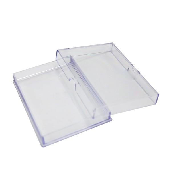 - Clear Hard Plastic Card Storage Box: Fifty (50) 3.5-in long x 2.5-in wide x 1/2-in high, 2-piece, friction-fit lid clear display cases for playing and trading card storage (25 cards)