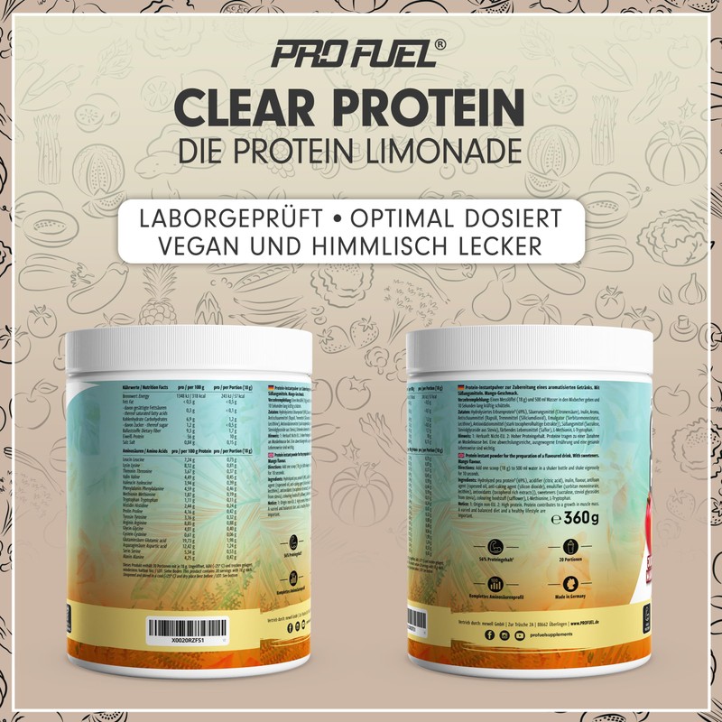 - Clear protein: our clear protein vegan is an incredibly delicious thirst quencher - packed with high-quality vegetable protein. The clear protein is refreshing, light and fruity and therefore the perfect alternative to a classic, creamy protein shake.