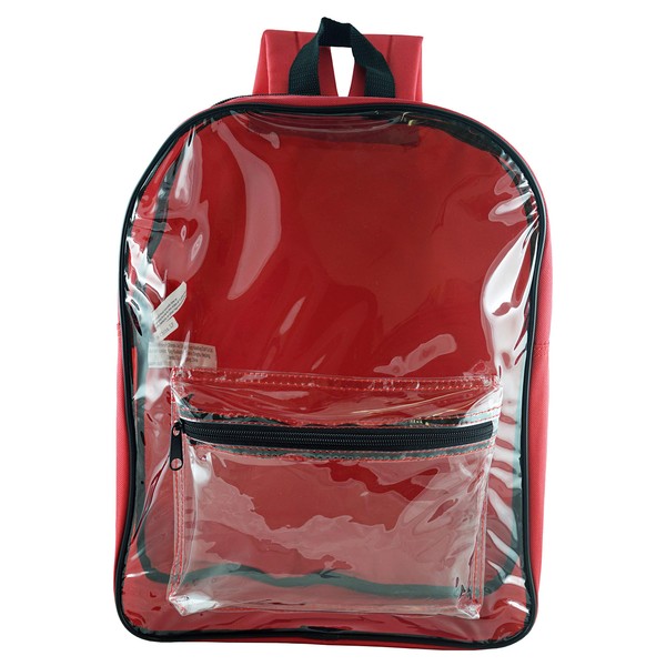 This Multipurpose Clear Backpack is approved and ideal for School use. It is available in five bright colors: pink, royal, black, light blue, and red. The Clear PVC front reveals the contents of the bag and front pocket. The colored backing distinguishes this backpack from others. It features a front zippered pocket, padded adjustable shoulder straps, and a carrying loop. 12” W x 14.5” H x 4” Gusset