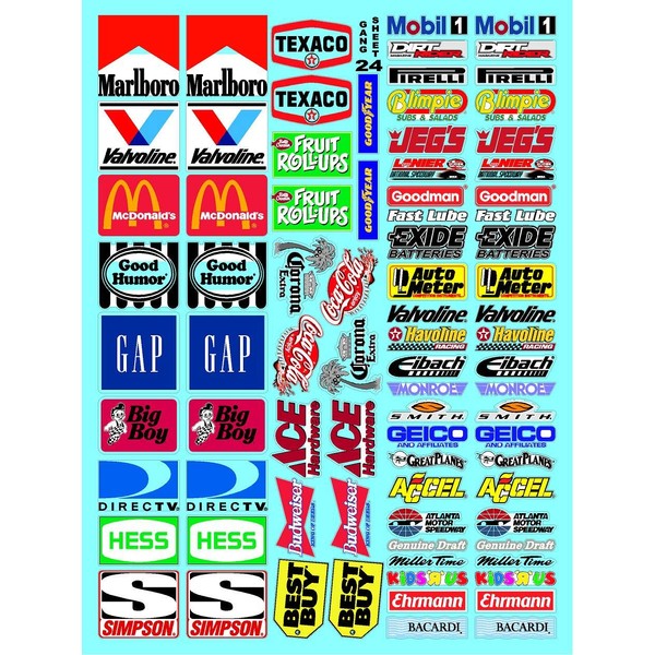 Clear Vinyl R/C Racing Sponsor Sticker Gang Sheet 24-1/24 – 1/16th Scale Model Decal Sticker Sheet Radio Control Lexan Body – Die-Cut to Shape - Peel & Stick – Water Slide