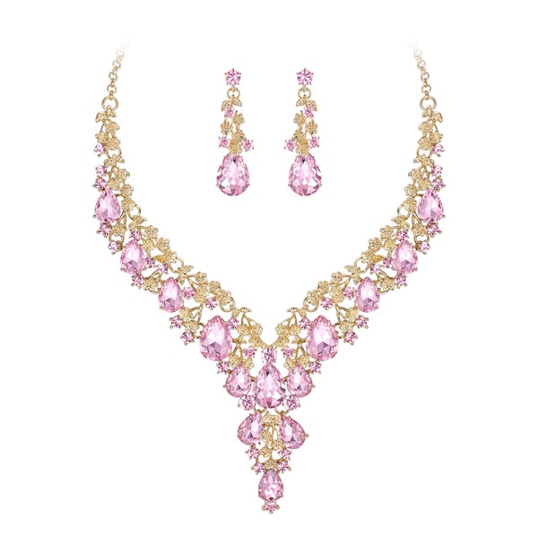Clearine Wedding Bridal Jewellery Set Teardrop Rhinestone Cluster Statement Necklace Dangle Earrings Set Fashion Jewellery for Women Pink Gold Tone, Crystal