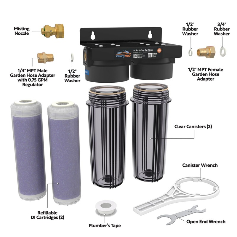 - ALL-IN-ONE KIT, READY TO USE: This deionized spot-free car rinse system includes a Dual DI Unit Housing with Mounting Bracket, Plumber's Tape, (2) Cartridges, Wrench, Adapters, Flow Regulator, and Instructions, making assembly a breeze