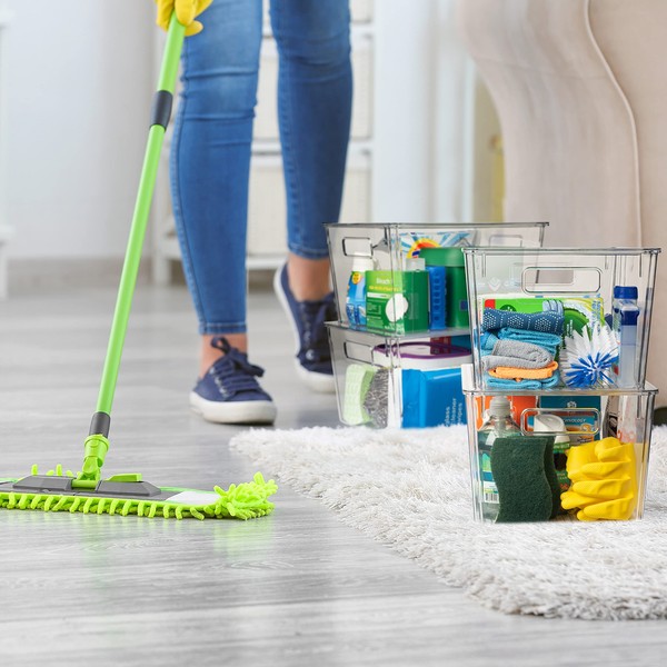 - PORTABLE & STACKABLE C Built-in, easy-grip side handles make it easy to transport from place to place. They also come with lids to help organize. These plastic storage bins are perfect for pantry organization and storage or kitchen organization. These clear storage bins are great for anywhere in your home.