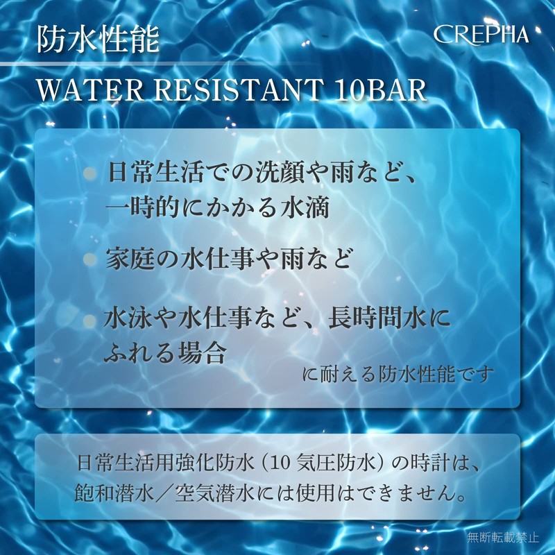 - Water resistant for everyday use: 10 bar