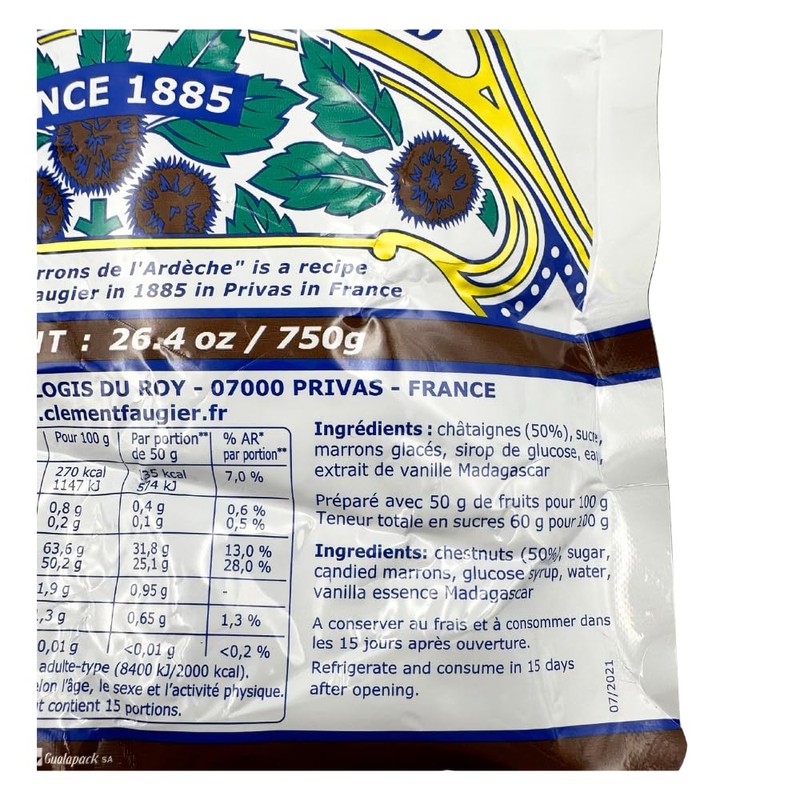 Clement Faugier sweetened chestnut spread, 750g. To produce this delicious chestnut spread, it begins with hand-picked, ripe chestnuts that are perfectly roasted to enhance their natural taste. These chestnuts are then made into a silky puree that has been lightly sweetened and scented with a dash of vanilla. The end result is a silky, rich spread with warm, earthy chestnut flavours. With a screw cap, this large pouch is easily resealable. The Clement Faugier chestnut spread is a sweet delicacy that may be used in a variety of ways. Spread it liberally on toast for a delicious breakfast or snack, or use it to fill crepes and pastries. It's a great ingredient for baking as well as for cream, ganache, and cakes. The picturesque French village of Privas, known for its chestnut farming and culinary heritage, is where Clement Faugier has his headquarters.