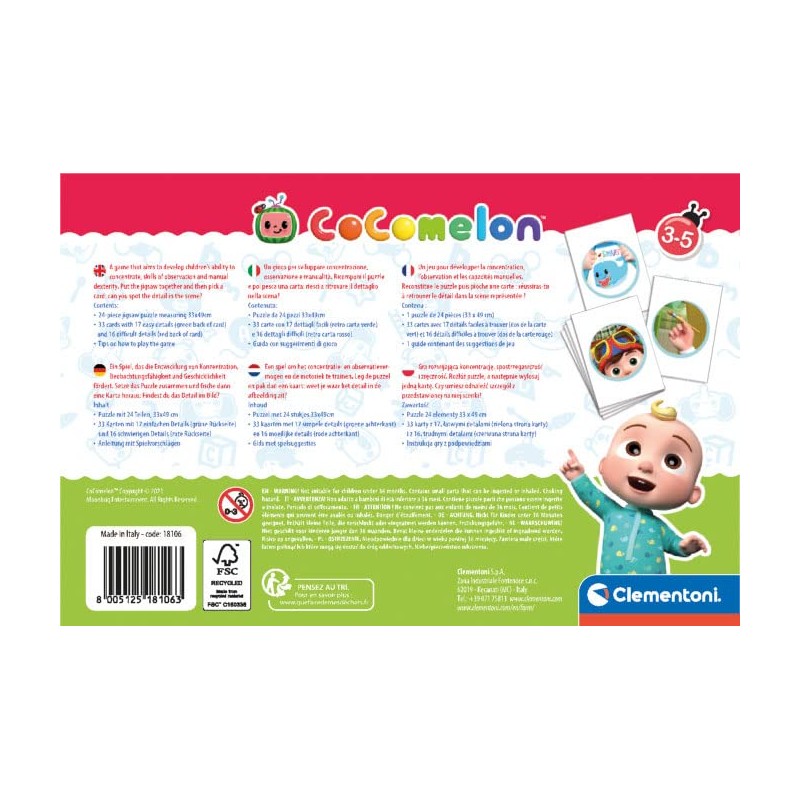 • A 24-piece puzzle measuring 62x42 cm plus a deck of 33 cards with details to search for in the image.