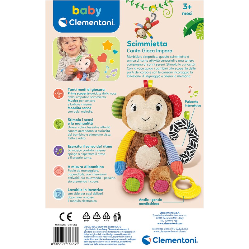 Clementoni - Monkey Sing, Play, Interactive Speaking Learning in Italian, Electronic Game Children 3 Months, Educational Plush Toy, 100% Washable, Multi-Colour, 17673