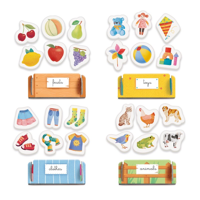- Contains: 24 shaped items, 24 double-sided cards with names in Italian and English, 24 English cards and 4 drawers to assemble for classification of items.