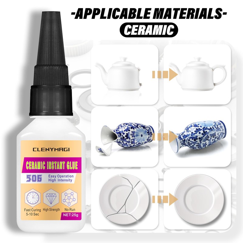- Clear Super Glue: ClenyMagi Ceramic Glue Gel Clear offers instant super bonding performance and exceptional repair capacity, enabling it to bond various materials such as pottery, glass, plastic and ceramic products. This ceramic adhesive is highly effective and cost-efficient. Our ceramic bonding glue includes adhesive instant glue, ensuring sustained viscosity for stabilizing and securing your sticky items during repairs or crafts