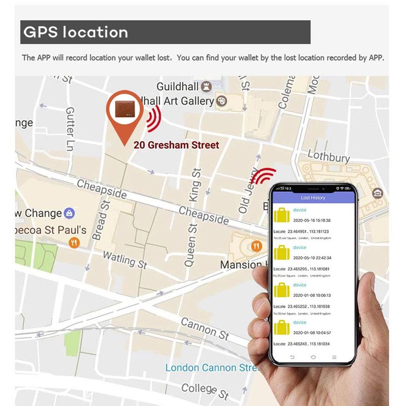 - 【Find the Wallet】 In case the wallet is lost, show its last known position on the phone to help find it. (Positioning is done through the phone GPS. The wallet itself doesn’t have a GPS module)