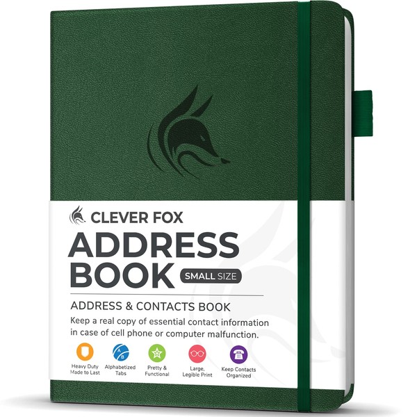 Clever Fox Address Book with alphabetic tabs - PU Leather Telephone and Address Book for Keeping Contacts Safe, Contact Organizer Journal, Small Size (4.0″ x 5.5″), Hardcover, Forest Green