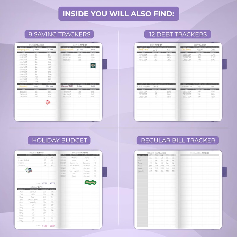 - Effortlessly Manage Spending, Debts, and Savings – This 12-month finance planner features an undated format with monthly calendars, budget plans, expense trackers, 8 savings and 12 debt trackers.