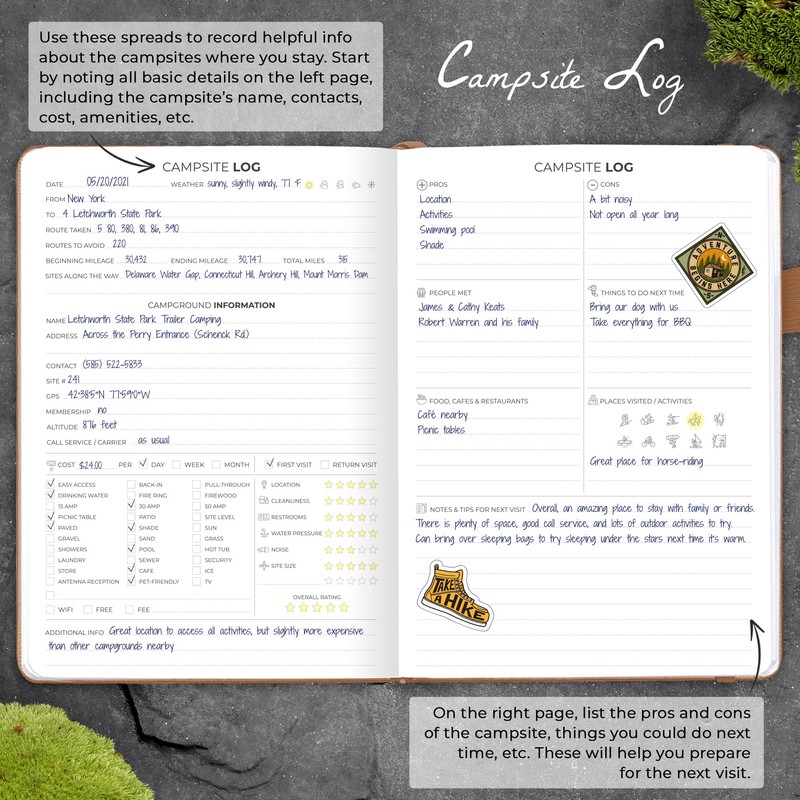 - STICKERS, USER MANUAL, BACK POCKET & OTHER EXTRAS: This camping log book comes with 3 sheets of stickers and a user guide. At the back, you will find an expandable pocket, where you can store maps, business cards, photos, and other loose papers.