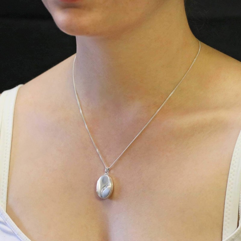 CLEVER SCHMUCK Set Silver Pendant Oval Locket 21 mm Partially Matt Curved Bow with Zirconia and Curb Chain 45 cm Sterling Silver 925 in Case White, Sterling Silver, Cubic Zirconia