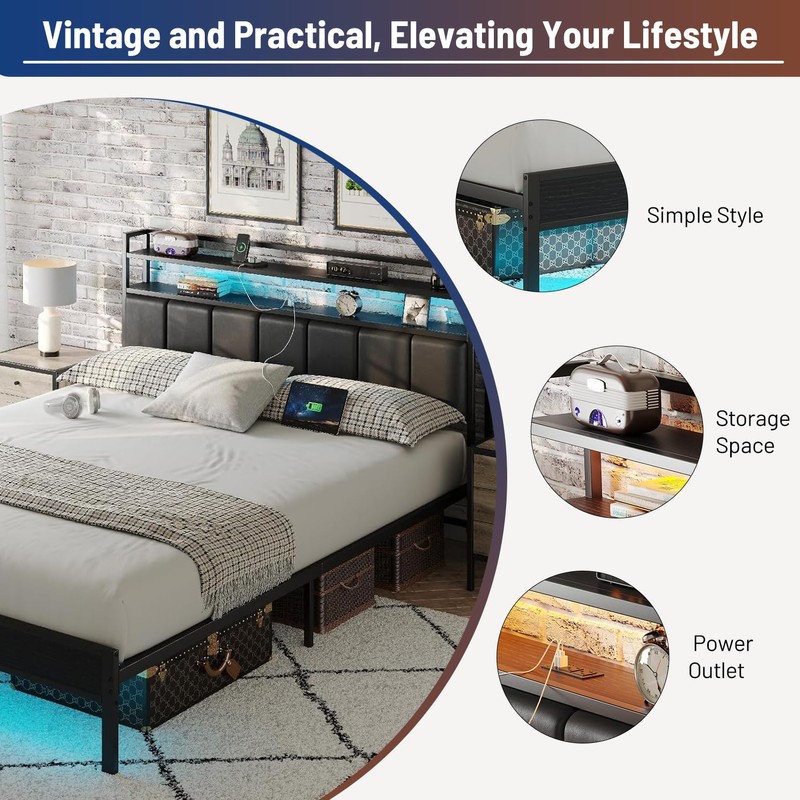 - Functional Headboard: With an expanded shelf, Perfect for holding your phone, glasses, and other necessities.For convenient charging, the headboard is equipped with pre-installed 2USB & 2 AC. This thoughtful design solves the low battery issue for your electronics while you're comfortably lying in bed.