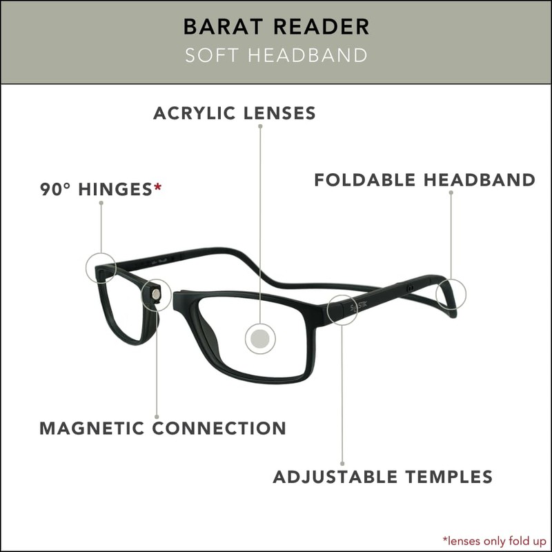 Clic Magnetic Reading Glasses for Men or Women, Soft Foldable Band, Computer Readers, Barat (M-XL, Matte Black, 1.50 Magnification)