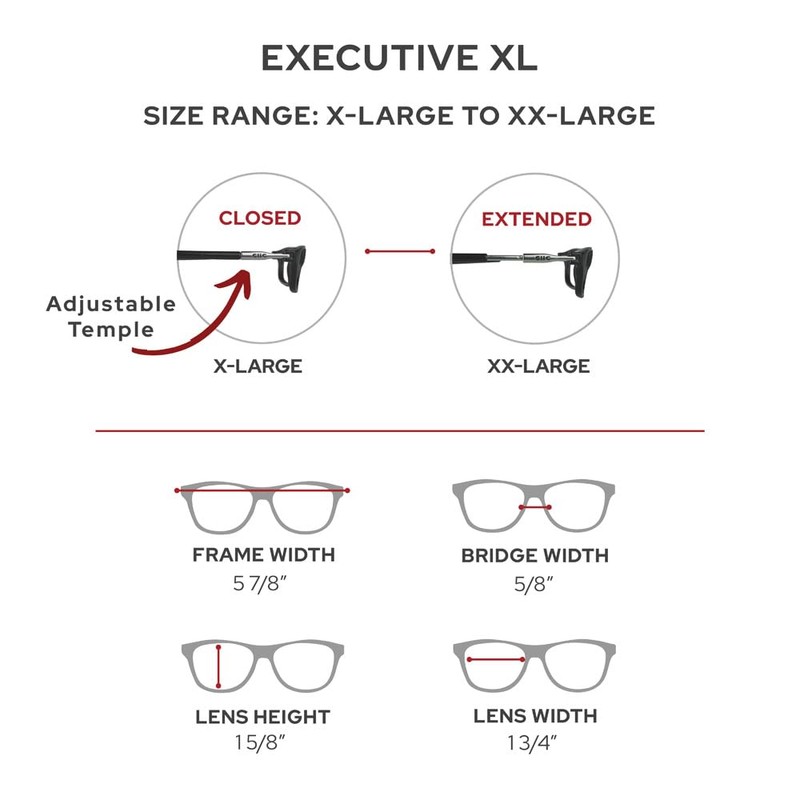 - SIZE RANGE: X-LARGE to XX-LARGE. All CliC glasses have adjustable temples that can be fully closed or extended to fit a range of sizes. Your size is determined by measuring the full circumference of your head to account for both the frame and permanent rigid headband...see our size chart for more details. The Executive XL is perfect for accommodating larger head shapes and sizes.