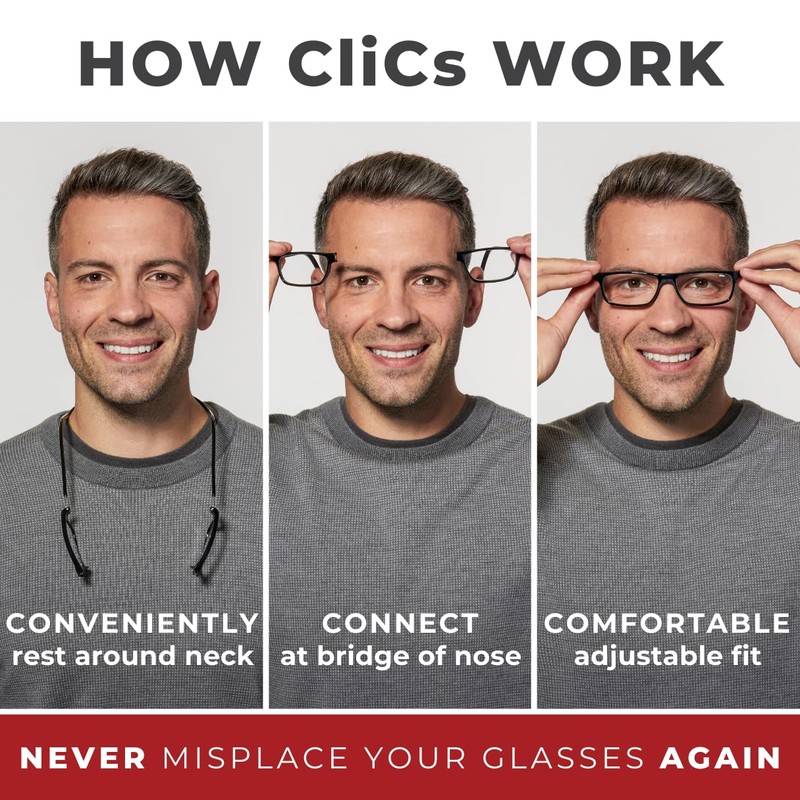 - NEVER MISPLACE YOUR READERS AGAIN. With CliC's exclusive front magnet connection and permanent rigid headband, taking them on and off is quick and easy. Adjust the temples for a perfect fit while wearing your glasses or have them comfortably lay around your neck when not in use. Never lose your glasses again with this built in convenience.