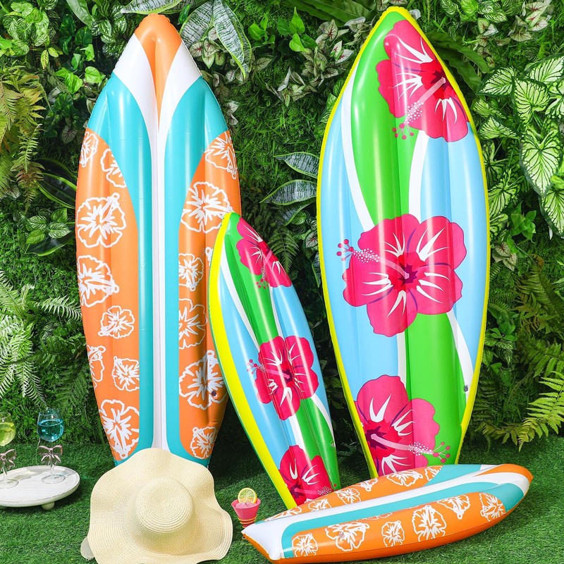 - Charming Design for Party: if you're planning a pool or beach party, our set of 4 inflatable surfboards will be your nice addition; Decorated with lively floral patterns, the surf board decor add a fun, tropical vibe to any gathering; Each surfboard is sized at around 36 x 13 inches, sure to be noticed and appreciated by your guests