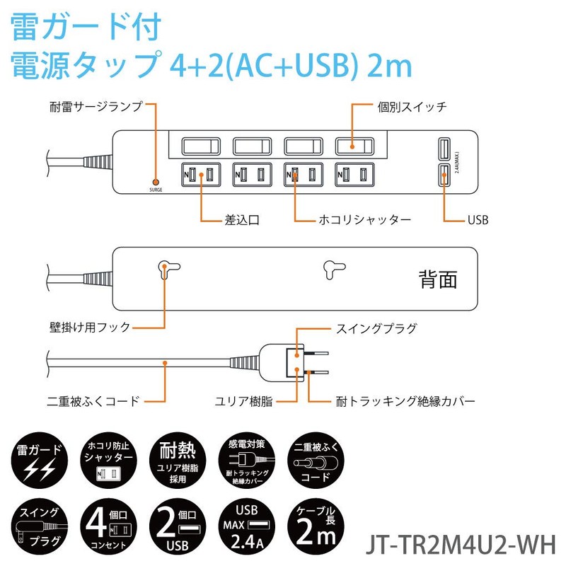 CLIENA JT-TR2M4U2-WH Power Strip, USB Charger, Lightning Guard, Individual Switch, Dust Shutter Included, 4 Slots + 2 USB Ports, 6.6 ft (2 m), Swing Plug, PSE Certified Model