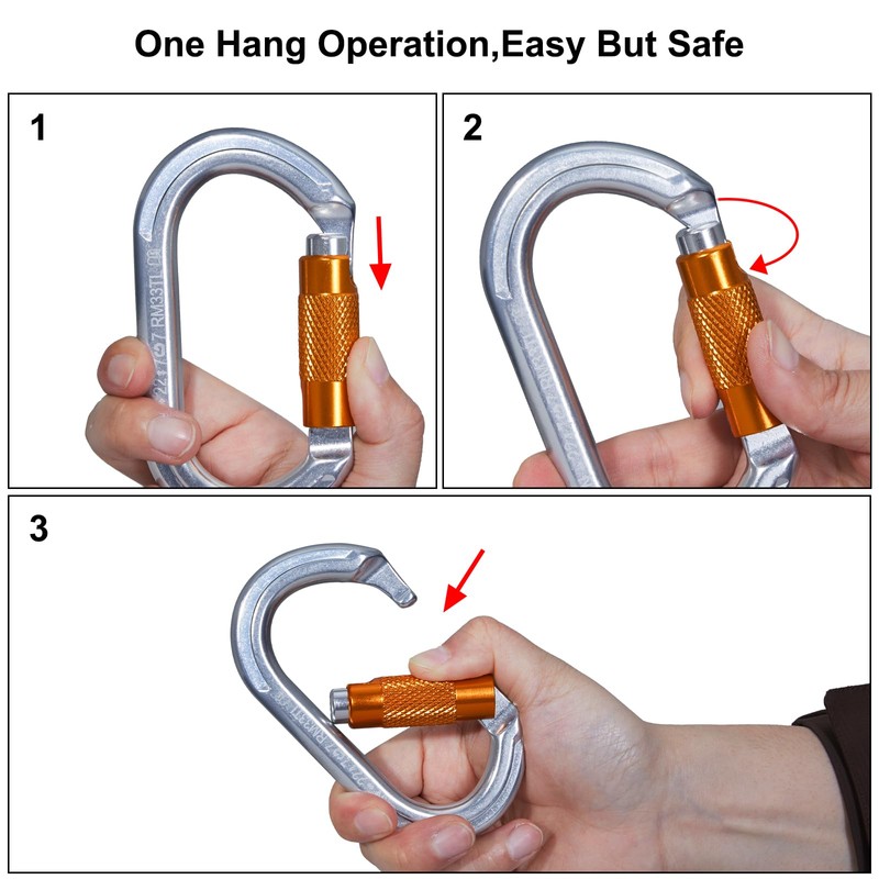 - 【Screw Gate】The textured safety nut protects the carabiner climbing from accidental sliding open and strengthens the strength of the gate. The internal spring automatically holds the gate closed and is operated with one hand Do not let go or allow objects to slip off.