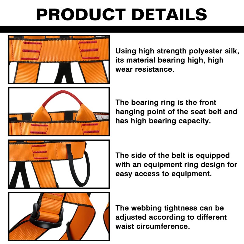 • High load capacity: our fall protection seat belt waist can carry a maximum weight of 1500 kg. Half body climbing harness. With a higher load capacity, the climbing harness is safer to use.