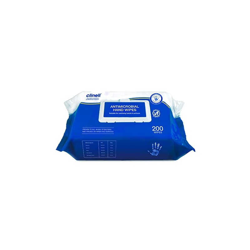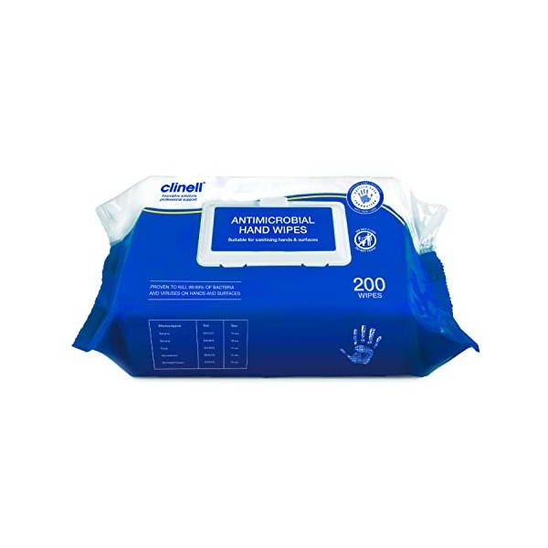 Clinell Clinell Antimicrobial Hand Wipes - Pack of 1 - 200 Wipes - Antibacterial, Suitable for Hands and Surfaces - Dermatologically Tested, Kills 99.99% of Germs