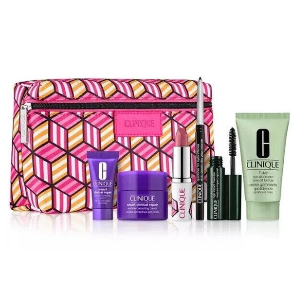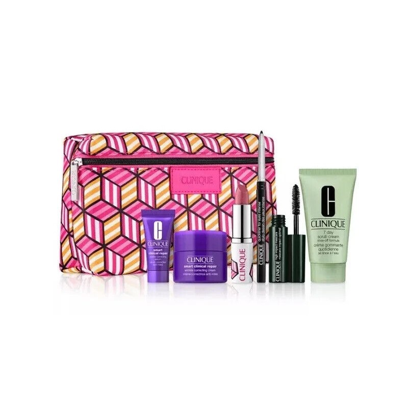 CLINIQUE 7 Piece Gift Set Smart Wrinkle Serum & Cream Quickliner Lipstick Scrub