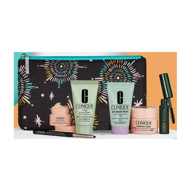CLINIQUE 7pc Gift Set Moisture Surge Eye Cream Mascara Quickliner Soap Scrub