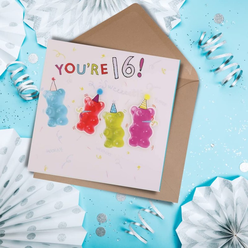 Clintons: Gummy Bears In Party Hats Birthday Card age 16, 16th Birthday Card open, 159x159mm, Multi-Colour, 1165915