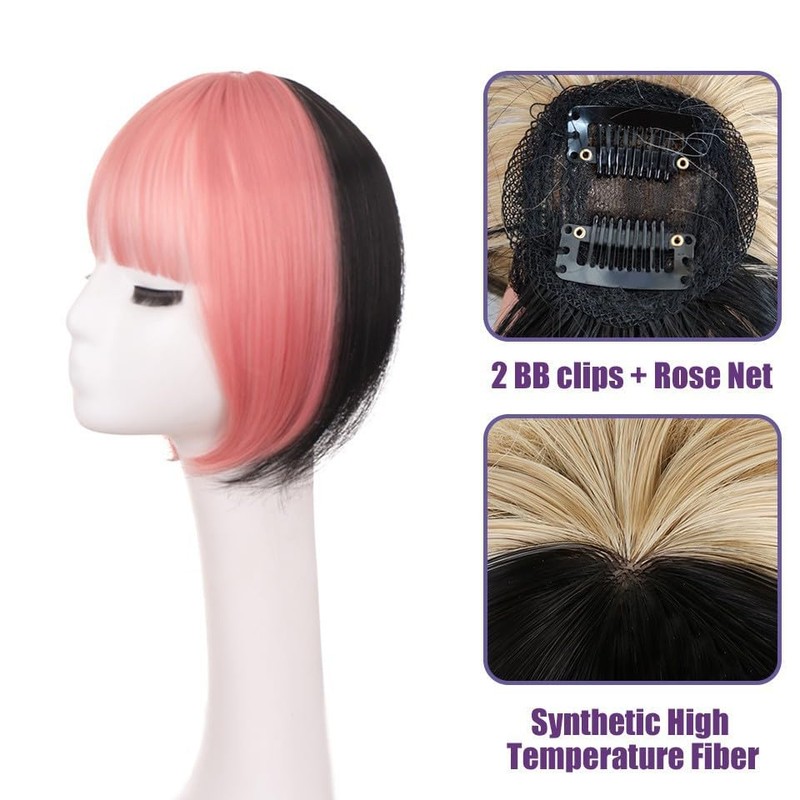 Clip in Bangs Straight mixed colour Fringe Hair Patch Synthetic Topper Cover Hairpieces with Bangs for Women Girls One Piece Bangs with Temples (Pink and Black, 20cm)