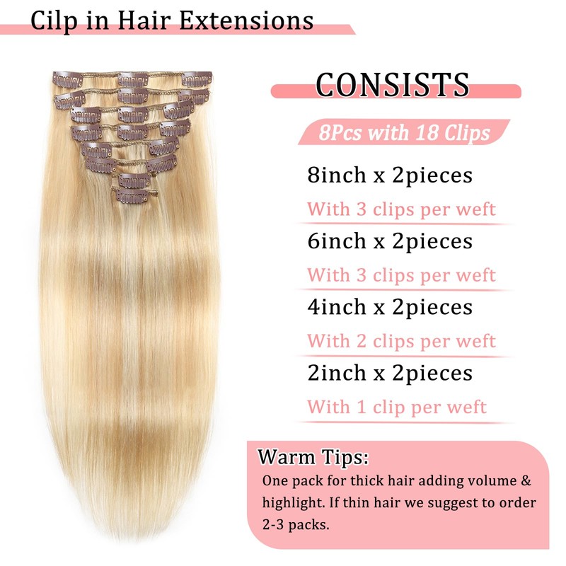 - Real Hair Extensions Clip in Human Hair Specification: Achieve your desired look with our natural thickness options, invisible, lightweight, and comfortable. Use 1 pack for fine hair or 2-3 packs for a full, voluminous style. Each set includes 8 pieces with 18 clips, and added 2 extra clips for your convenience.
