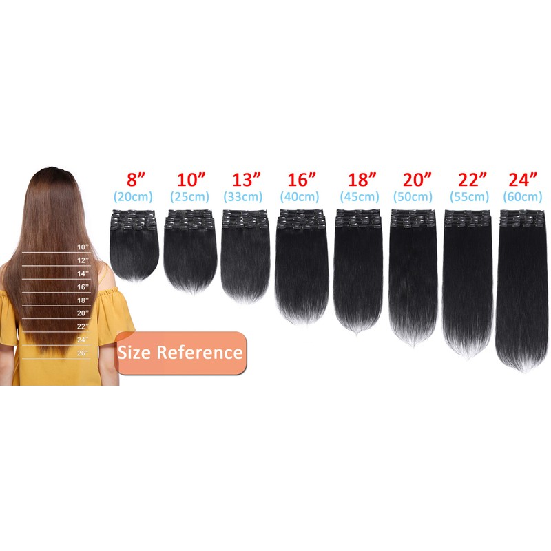 - Set contents: 8 wefts (hair pieces), 18 clips: 2 x 20 cm wide wefts ~ 3 clips each, 2 x 15 cm wide wefts ~ each 3 clips, 2 x 10 cm wide wefts ~ each 2 clips, 2 x 5 cm wide wefts ~ 1 clip each.