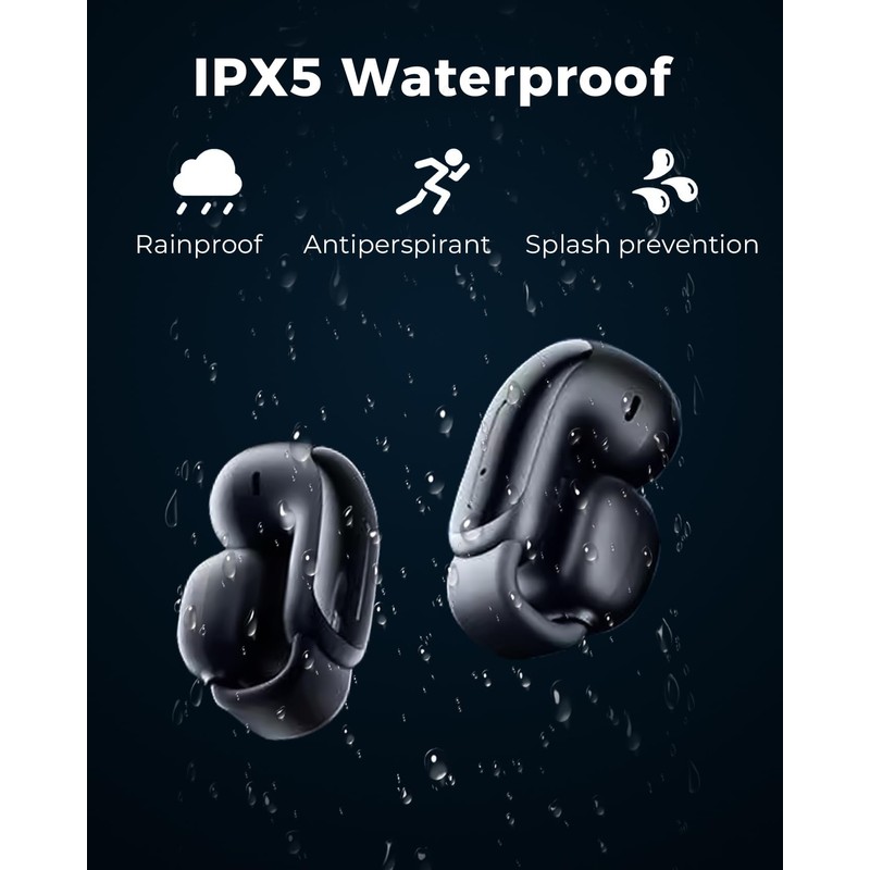 - [IPX5 Waterproof & Sweatproof for Active Lifestyles]--Rated IPX5 waterproof, these earbuds resist sweat, rain, and splashes, making them ideal for outdoor adventures or intense gym sessions. Unlike bulkier over-ear models, the sleek clip design pairs effortlessly with helmets, glasses, or hats, catering to runners and cyclists prioritizing safety and freedom