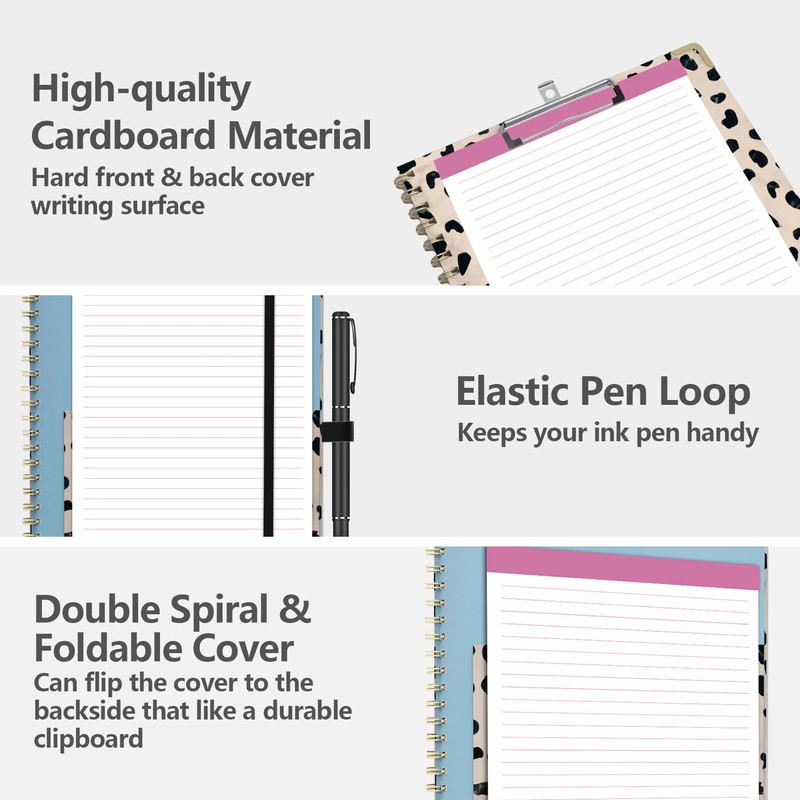 - 【Multi-Functions】A clipboard, organizer, and notebook all in one, very handy. Metal clip can holds up to 80-100 sheets paper. Hidden retractable hanging hole on the top, easy to hang. Clipboard folder has double-loop Metal Spiral have the ability to flip the cover to the backside, no creases and cracks to offer durability. Pen Loop for quick and easy storage, provide a sturdy place to write anytime.