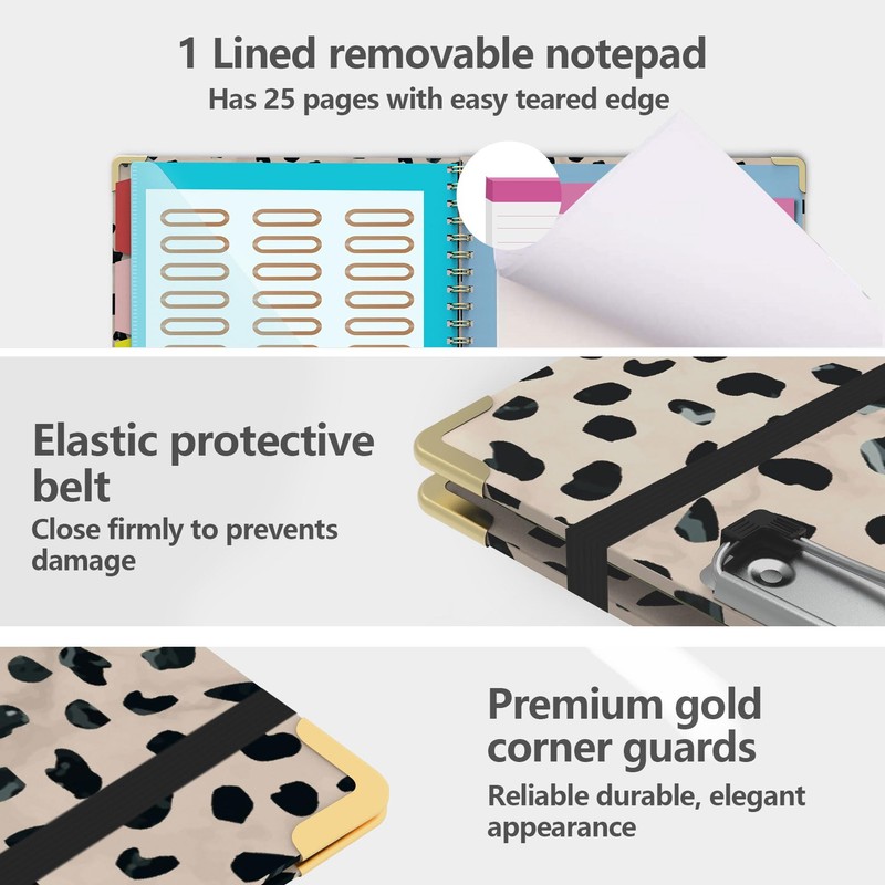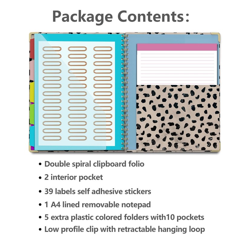 Clipboard Folio with Notepad for Letter Size (11" x 8.5"), 5 Extra Folders with Storage 10 Pockets, 39 File Folder Labels, Elastic Closure Spiral Clipboard with Storage(Cheetah Spots)