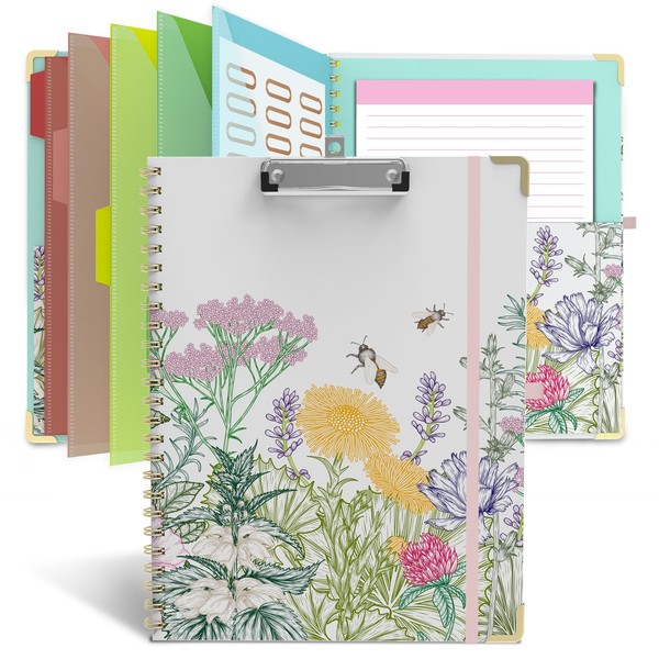 Clipboard Folio with Storage 8.5 X 11 Padfolio Notebook, Clipboards with Notepad Spiral with 10 Pockets and 5 Folders Nursing Teacher School Essentials (Wild Flowers)