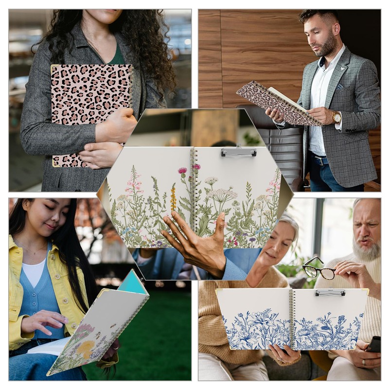 - 【Notepad & Writable surface】Includes an 11"×8.5" removable notepad (25 sheets) that swaps out effortlessly. The sturdy metal clips can easily hold the paper, providing you with a writing surface for convenient work , and the 360° spiral binding lets you flip the cover back for one-handed writing