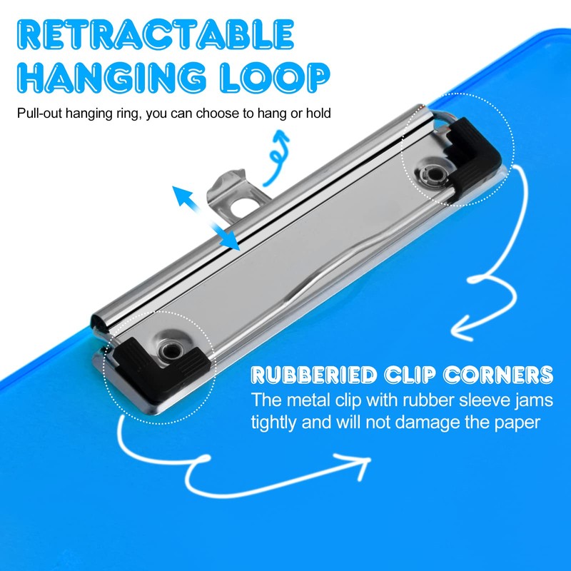 - RETRACTABLE HANGING LOOP: The transparent color plastic clipboards have a built-in hanging hole, which can help you place your documents randomly. And it can be stowed away when not needed.