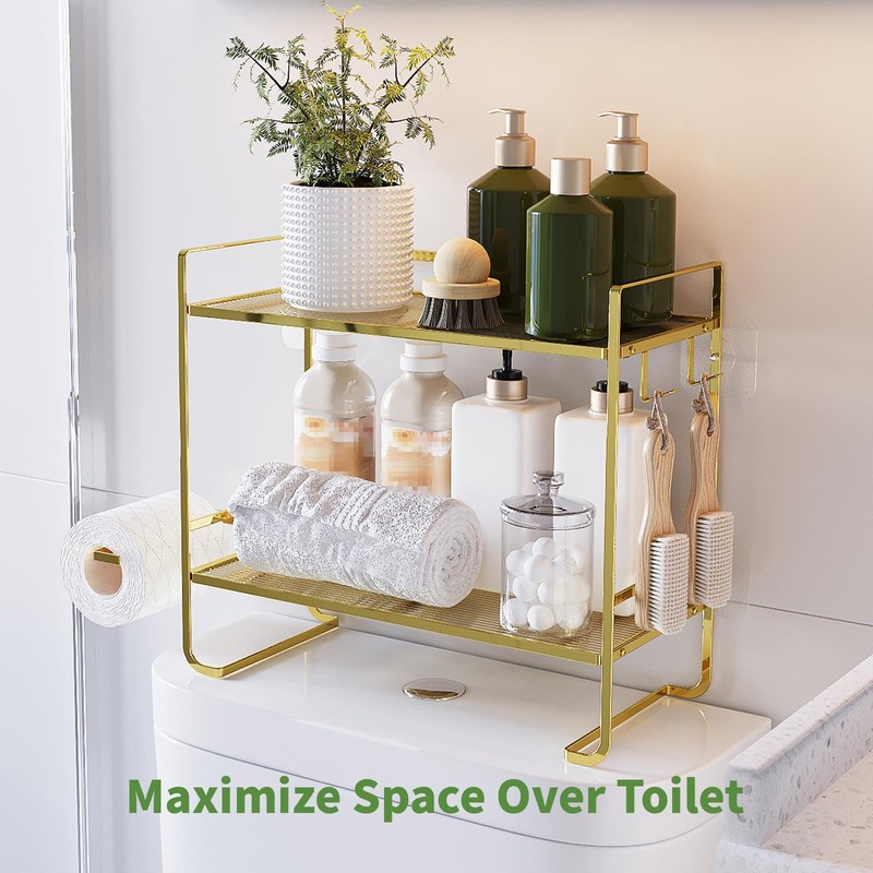 Clirass 2-Tier Over Toilet Storage Shelf, Bathroom Organizers, with 2 Hooks & 1 Paper Holder (Gold)
