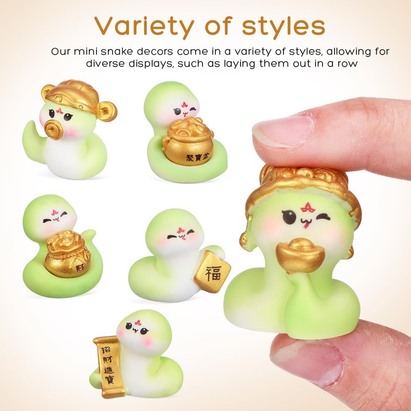 - Mini Snake Figurines Tabletop Snake Decorations: Celebrate Year of the Snake in style with our Mini Snake Figurines Tabletop Snake Decorations. Made from premium resin, these snake-shaped decorations are built to last. Their design and impeccable craftsmanship make them a suitable addition to your festive decorations. Hang them on your shelves, car dashboard, or to bring good luck and prosperity to your surroundings