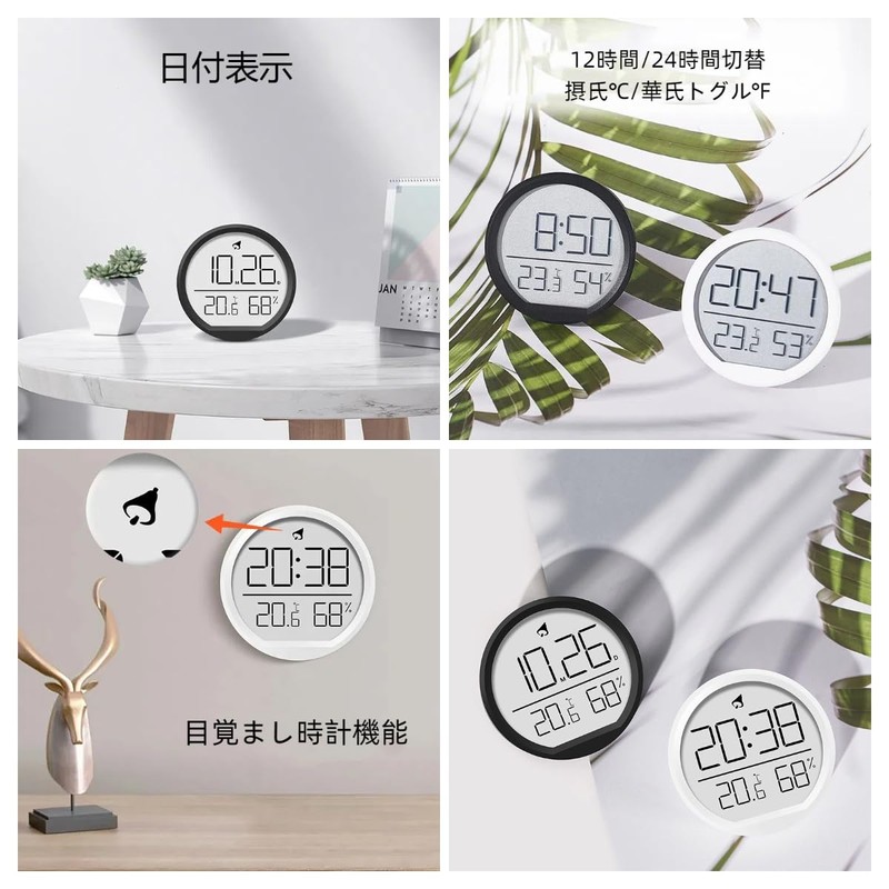 Time Display (12/24HR), Date Display, Temperature Display, Humidity Display, Electronic Sound Alarm Clock The simple and compact design only fits in the palm of your hand, making it easy to put in tight spaces.