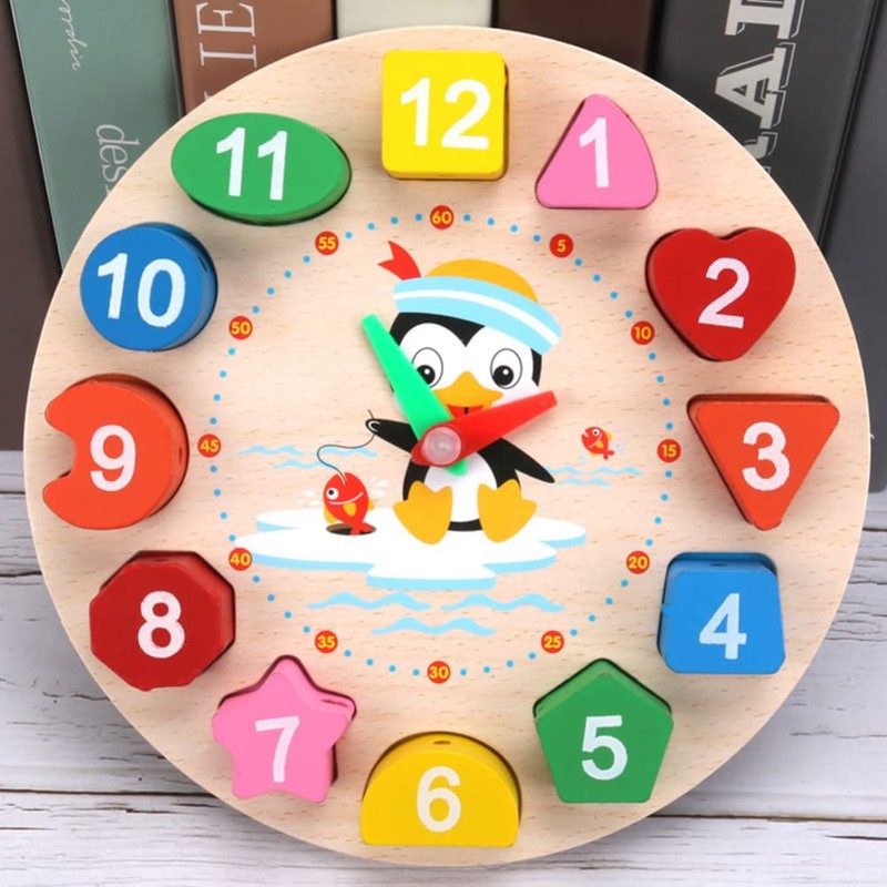 Clock Toy Wooden Teaching Clock Props Penguin Pattern Clock Toys Teaching Time Number Puzzle Stacking Montessori Educational Toys for Toddlers