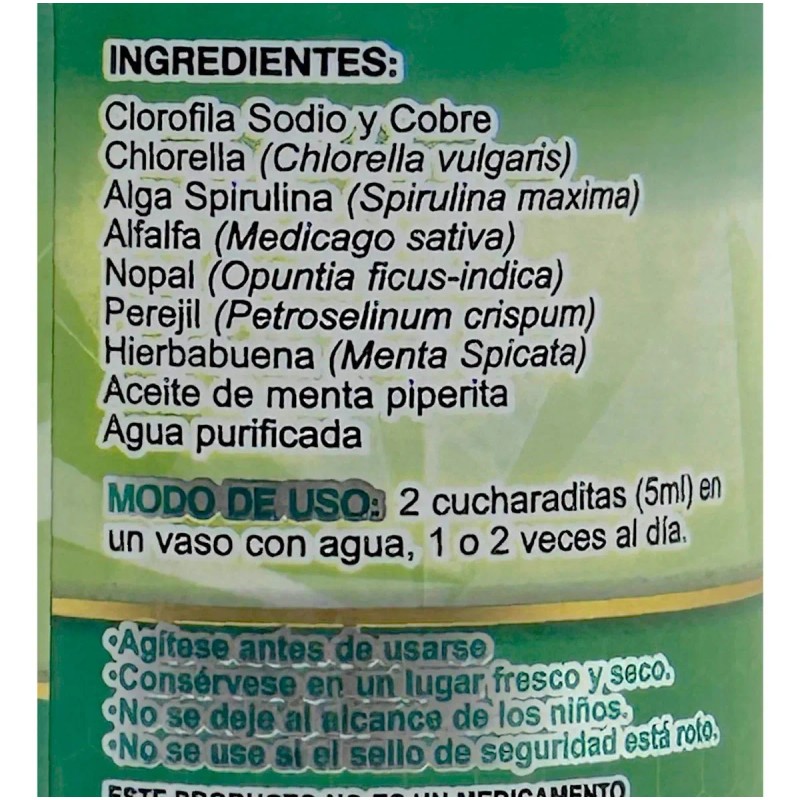 Con una mezcla única de ingredientes naturales como clorofila, chlorella, alfalfa, nopal, perejil y el potente alga spirulina, cada gota es un regalo de la naturaleza. Además, el toque de menta piperita aporta una frescura que te encantará. 🌿🍃