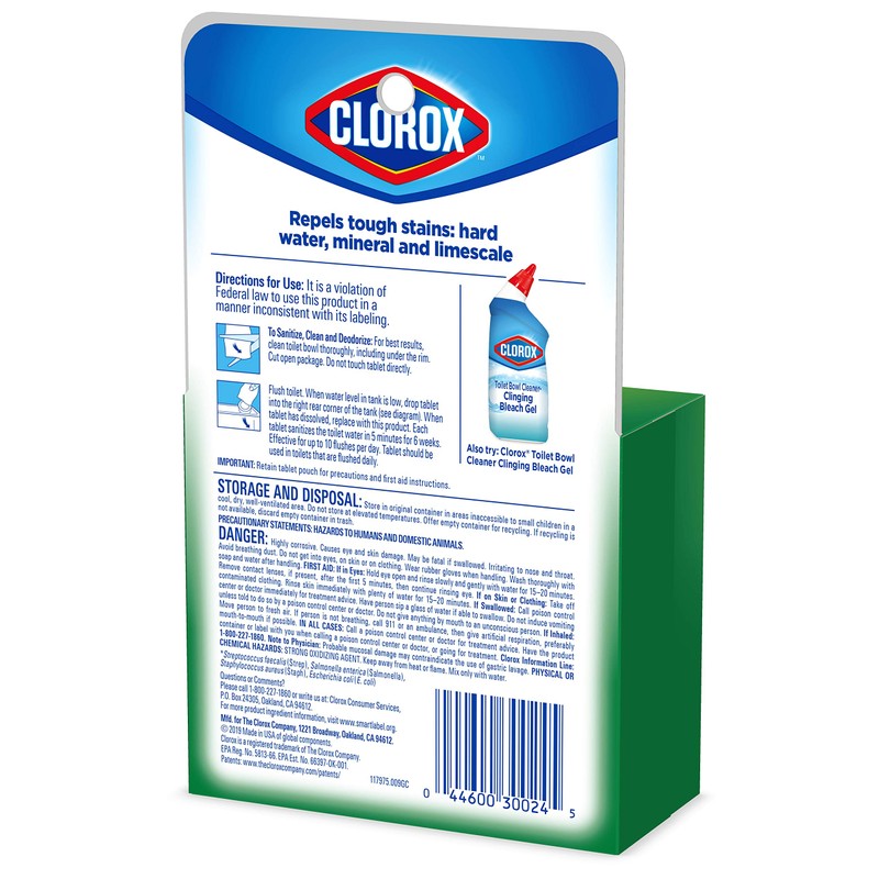Clorox Automatic Toilet Bowl Cleaner tablet cleans and deodorizes with the power of bleach and kills 99.9% of household bacteria in the toilet bowl water. Each tablet sanitizes the toilet bowl water in 5 minutes, cleans for up to 3 months and helps prevent tough hard water, mineral and lime scale stains. These easy to use tablets keep your toilet smelling fresh and sparkling clean with every flush, leaving bowl water crystal clear. To sanitize, clean and deodorize, simply drop a tablet in the toilet tank and let it do its work. The tablet does not harm the septic tank. With Clorox, you know your toilet bowl is clean and disinfected.