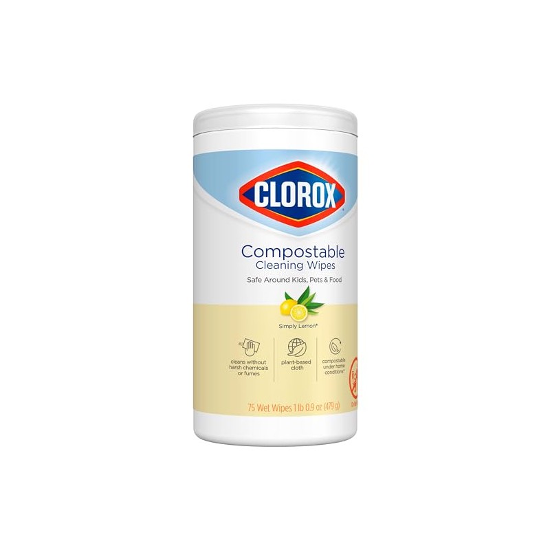 The clear solution for a clean home. Safe around kids, pets and food contact surfaces when used as directed, Clorox Free & Clear Compostable Wipes are formulated without dyes, bleach or ammonia yet deliver a powerful clean thats gentle on surfaces. These lemon scented Clorox wipes pick up dirt and compost back into dirt. These compostable wipes are tough on grease and can cut through grime on a variety of hard surfaces like acrylic, sealed fiberglass, sealed granite, finished hardwood and vinyl. The perfect addition to your household cleaning supplies, Clorox Compostable Wipes meet the US EPAs Safer Choice safer product standards. and made from plant based fibers that are compostable under home conditions only*. Grab these easy, accessible cleaning wipes for everyday cleanups and tough messes. *For home composting: Do not compost wipes if used to clean non compostable messes, such as human or animal waste. Wipes should generally be no more than 10% of total home compost pile. **When used as directed