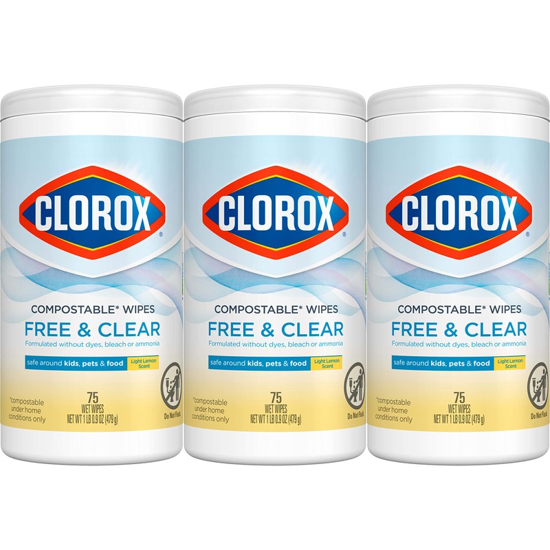 CLOROX Clorox Free & Clear Compostable Cleaning Wipes, Light Lemon Scent, 75 Count, Pack of 3 (Pack May Vary)