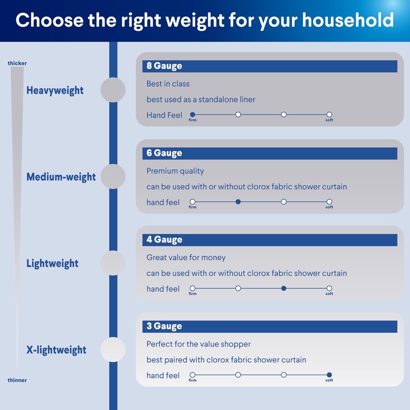 - Two Colors/Finishes: These shower liners are available in clear and frosty finishes. The clear design coordinates with any bathroom decor while the frosty design provides more privacy.