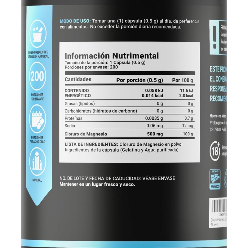 Cloruro de Magnesio 500 mg. 200 Cápsulas Ingredientes naturales. Chloride Mag B Life